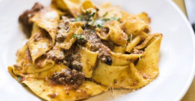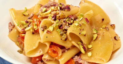 Pacchero con pesto di pistacchio pomodoro e bacon